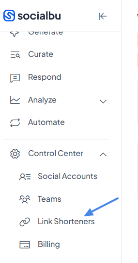 Now, you need to go to the Control Center > Link Shortener in SocialBu