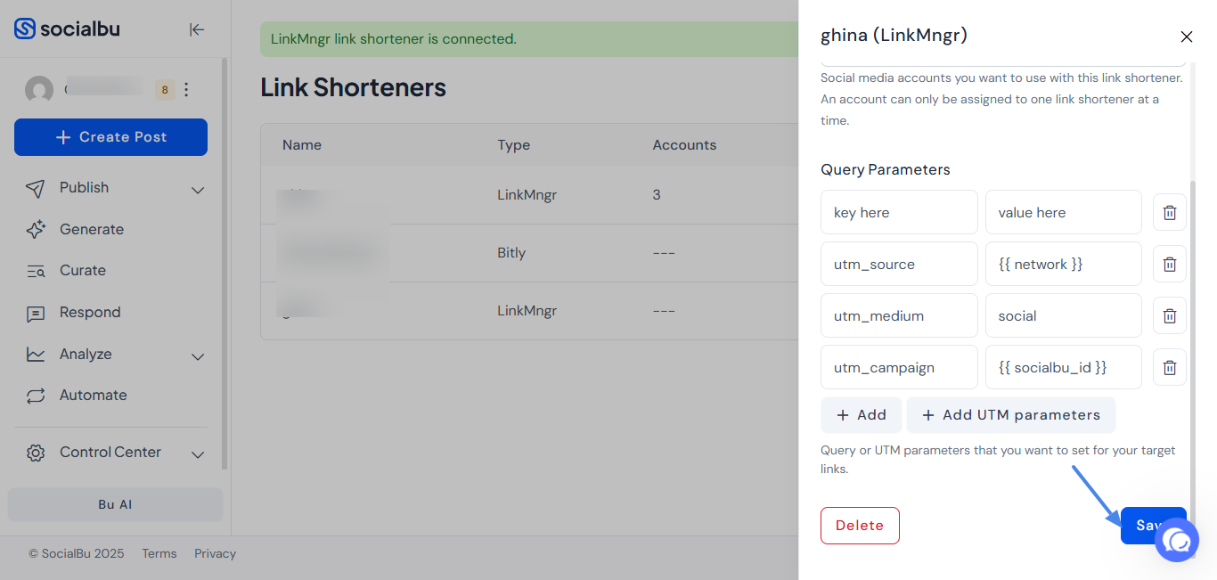 Then, add the social accounts for which you want to shorten links, you can add multiple accounts if needed. Once done, set up the remaining details such as Query or UTM parameters, and click Save.