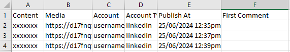 First Comment (optional): Add a comment to be posted as the first comment. You may leave it blank for individual posts or remove the entire column if you don’t want to use it at all.