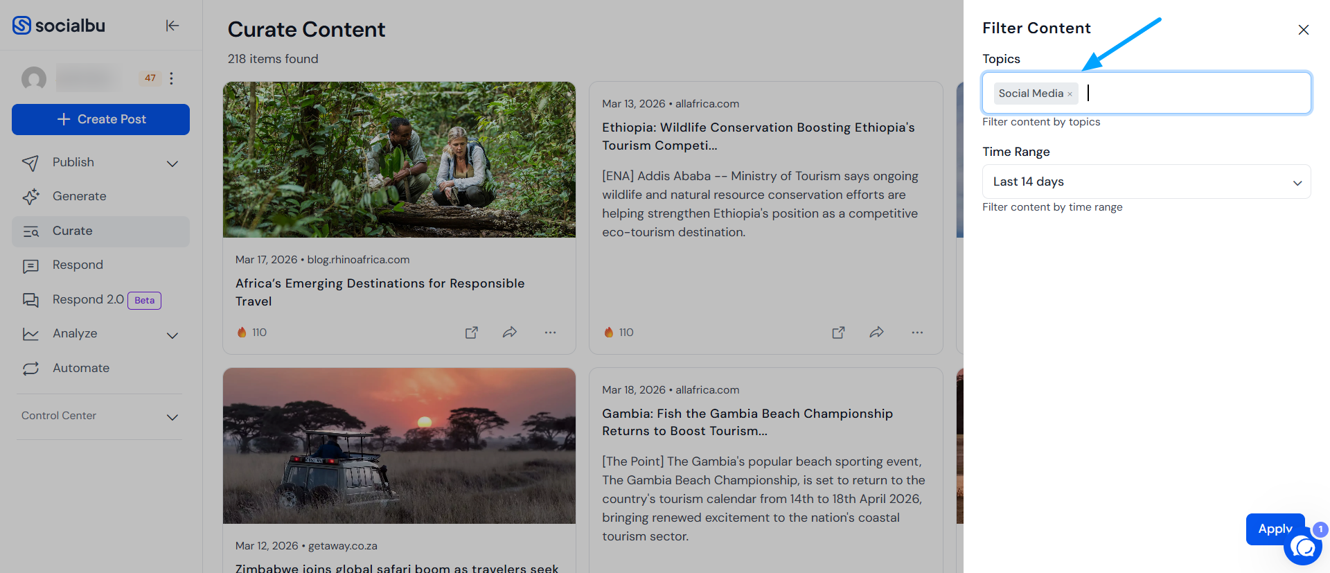 Use advanced filters like topics, keywords, or time ranges (e.g., "Last 7 days") to narrow down your content results.